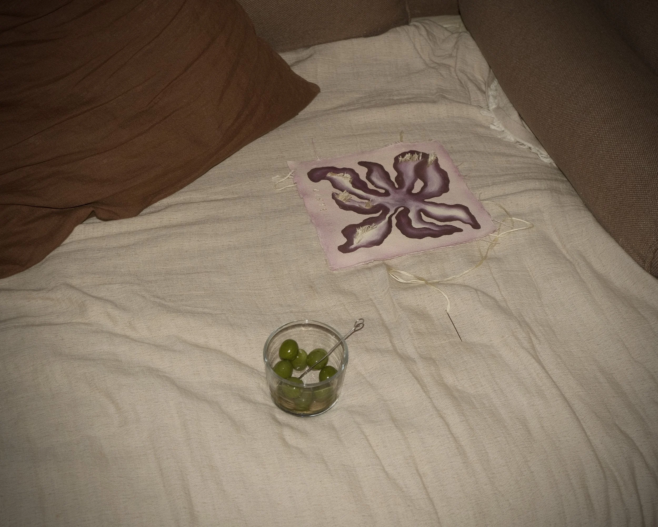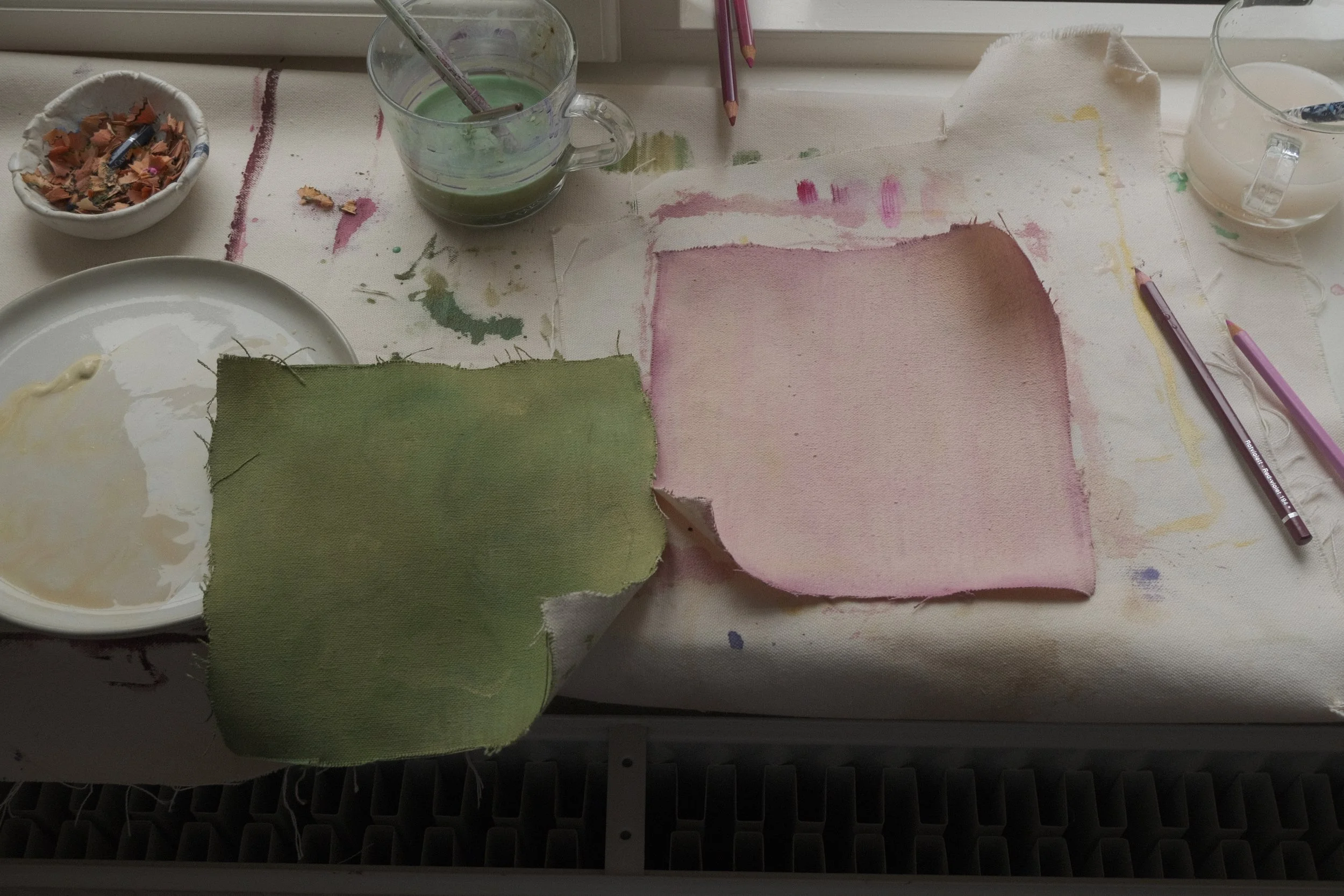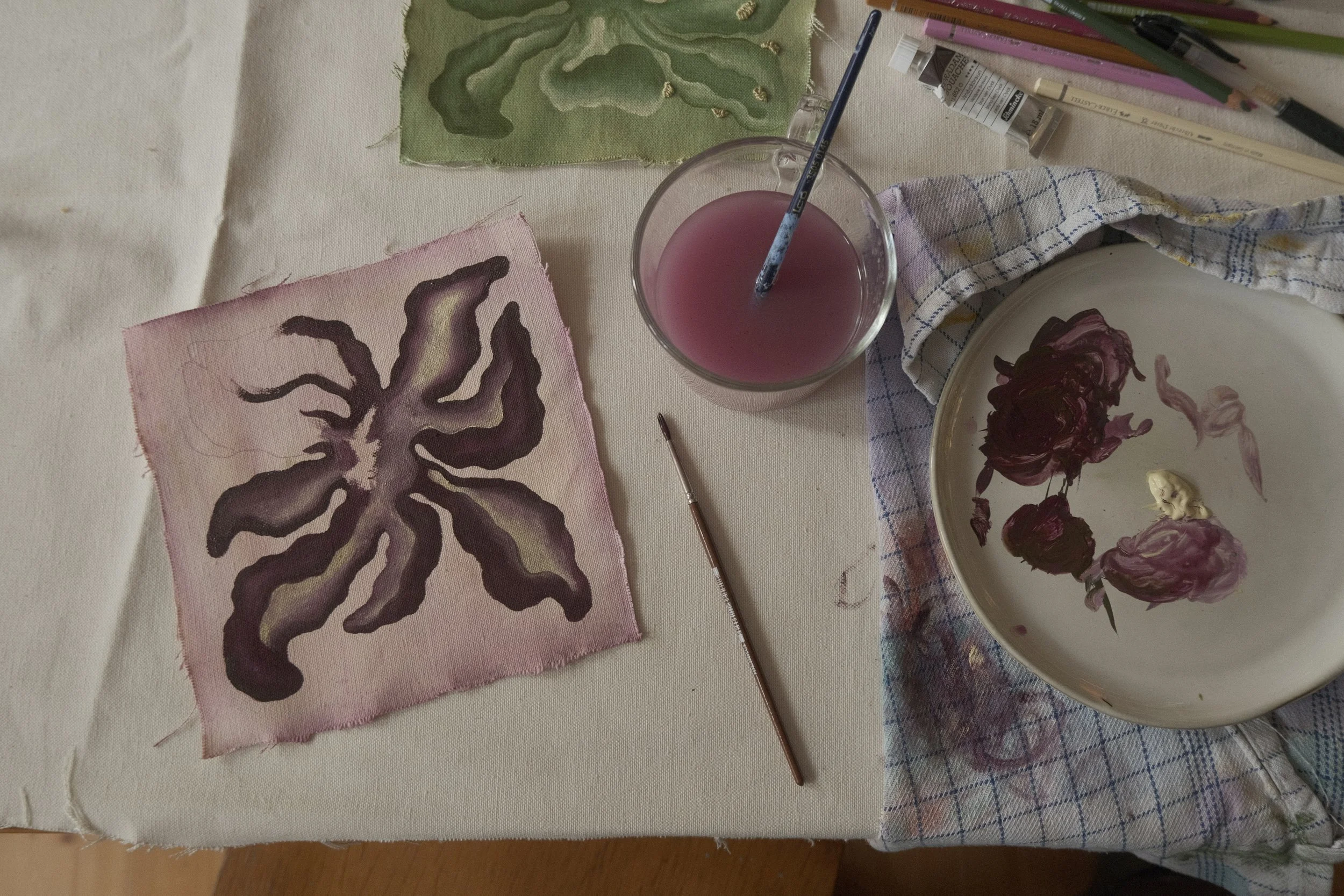 “Listening” Calm Flower — Gouache, brodering og glimmer på lærred.